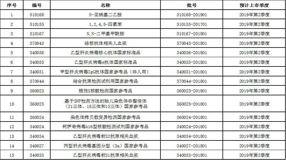 現公布中檢所15個即將上市的新品種,上市時間為2019年第二季度,具體情況如下表: